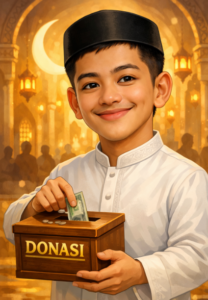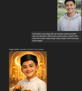 Alter Ego Ramadan: “Buat karikatur saya sebagai alter ego Ramadan: pribadi yang lebih sabar dan dermawan. Outfit: busana muslim modern. Properti: kotak donasi dan suasana masjid dengan cahaya hangat. Mood: tenang dan penuh harapan.”