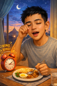 Pejuang Sahur: “Buatkan karikatur saya sebagai pejuang sahur. Outfit: pakaian santai rumah. Properti: alarm berbunyi, meja makan sederhana, langit subuh kebiruan. Ekspresi: mengantuk tapi semangat.”