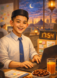 Karikatur Profesi Versi Ramadan: “Jadikan saya karikatur yang merepresentasikan pekerjaan saya selama Ramadan. Tambahkan elemen khas profesi saya dan suasana kantor menjelang waktu berbuka. Mood: produktif tapi tetap khusyuk.”